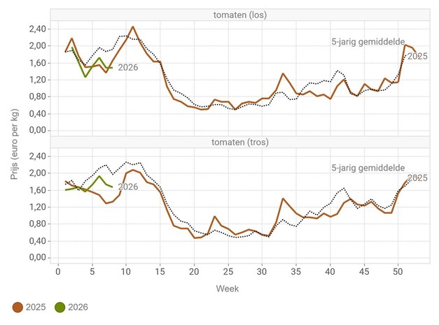 Con volúmenes, en muchos casos, significativamente inferiores, los precios medios de la semana 8 en las subastas de la Federación de Cooperativas Hortícolas Belgas han sido, en general, muy superiores a los del año anterior. Los tomates son una excepción a la norma, con mayores volúmenes que el año pasado. Eso sí, el precio medio de los tomates en rama, que se sitúa en 1,67 euros por kilo, supera al del año anterior. Los tomates sueltos, que se venden por 1,49 euros por kilo, sí registran un precio inferior al de hace un año.