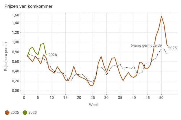 El precio de los pepinos sigue superando al del año anterior, aunque no tanto como en la semana 7. El precio medio en la semana 8 asciende a 74 céntimos de euro.