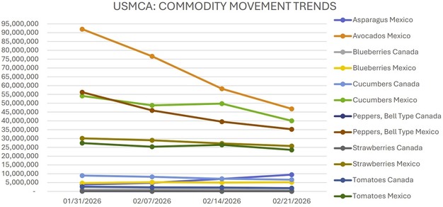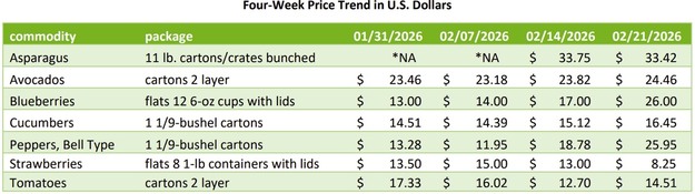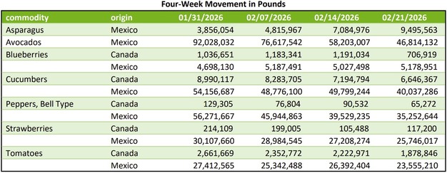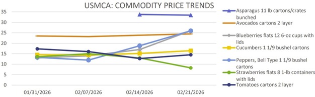Los patrones de movimiento en las principales categorías de frutas y verduras siguen siendo mixtos, con varios artículos que registran ajustes de precio en medio de condiciones de suministro variables en los cruces y puertos de entrada de Estados Unidos.