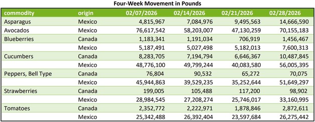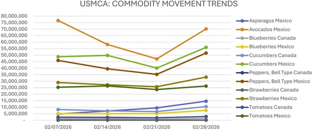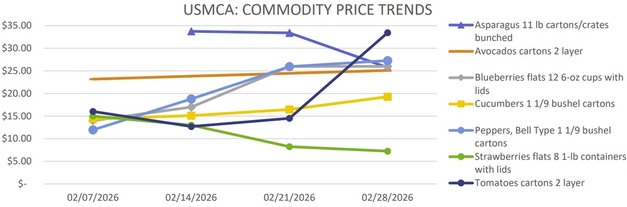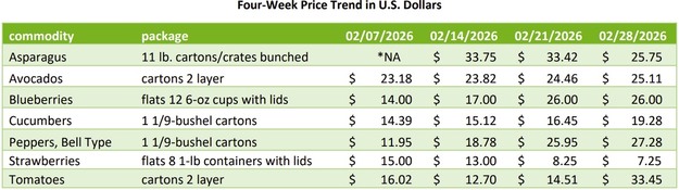 Se espera que los envíos de espárragos de México a través de Calexico, California, y San Luis, Arizona, se mantengan estables. El comercio comenzó lentamente pero se fortaleció más tarde en el periodo. Los precios disminuyeron ligeramente, con cajas de 11 libras de espárragos grandes en manojos que en su mayoría oscilan entre US$24.75 y US$26.75, mientras que los tamaños estándar se encuentran en su mayoría entre US$22.75 y US$24.75.