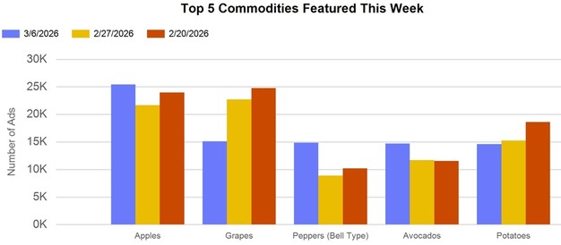 Espárragos, aguacates, pimientos, berries, melones y tomates también aparecieron en las ofertas, en línea con propuestas de comidas primaverales más ligeras. Al mismo tiempo, productos habituales durante todo el año como las uvas, las manzanas y las patatas mantuvieron una fuerte presencia en los folletos promocionales.