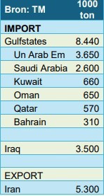 Los países del Golfo importan sobre todo de Sudáfrica, Egipto, China y Ecuador. Los principales productos son manzanas, naranjas, cebollas, dátiles, bananas, mangos, limones, frutas exóticas y ajos.