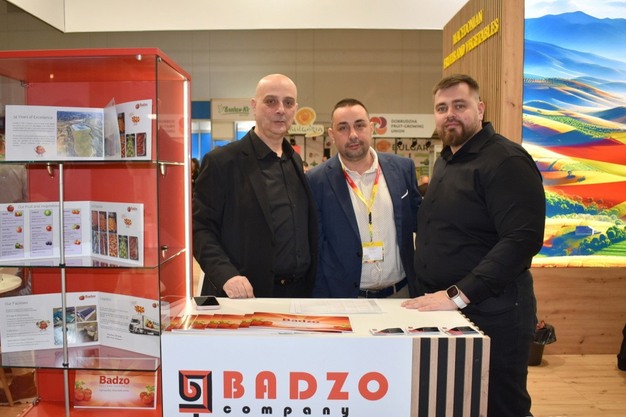 Ivan Popov (izquierda), Vasil Shapkarov (centro) y Anton Semenov (derecha), de Badzo, en Fruit Logistica 2026.