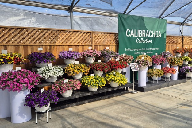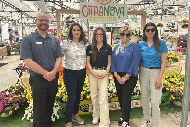Petchoa es un género totalmente nuevo para el equipo de Ball FloraPlant. Este híbrido tolerante al frío presenta los colores brillantes de la calibrachoa combinados con las grandes flores y las fuertes raíces de las petunias. CitraNova Limone y CitraNova Lemon Zest duran hasta bien entrada la temporada. Algunos de los presentadores del ensayo delante del expositor de "color recién exprimido" (de izquierda a derecha): Henry Roberts, Sarah Swofford-Hernandez, Jaden Gimondo, Maria Bolinger y Claire Melvin.
