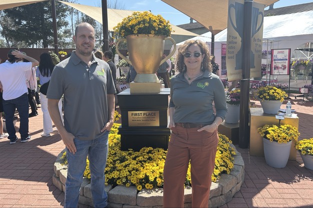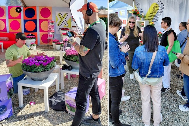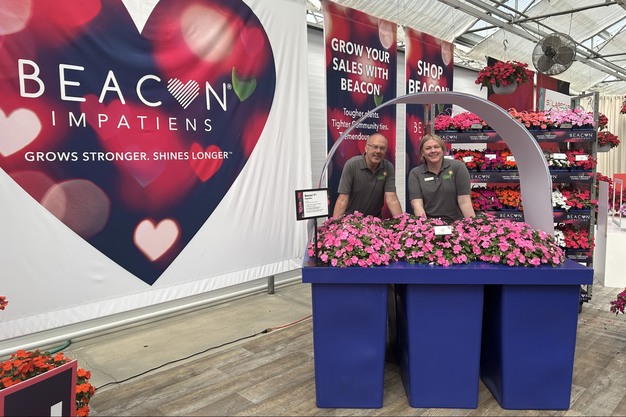 Mark Gross (izquierda) y Kat Wolper (derecha) sonríen junto a la nueva Impatiens Beacon Pink, una opción resistente a las enfermedades para la sombra que resiste al mildiú velloso de las Impatiens. Los invitados a las pruebas se divierten tomándose fotos junto a este paquete de seis a tamaño real. El nuevo color azul oscuro de la marca estará disponible para 2027.