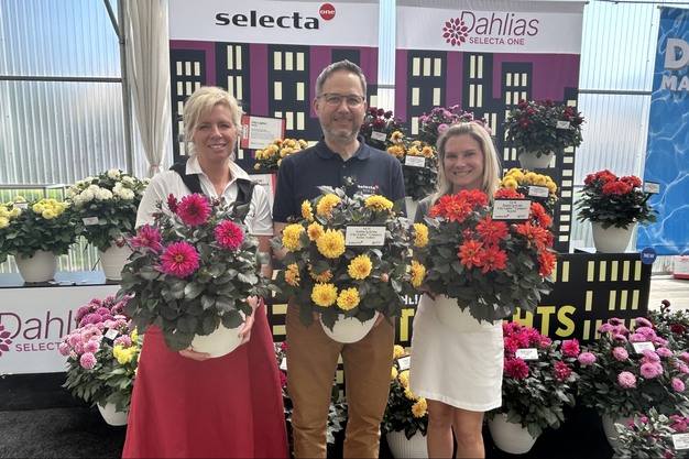 Ha habido una gran conversación en torno a la nueva serie City Lights Compact de dalias de patio de Selecta One en California Spring Trials. El follaje de color oscuro contrasta maravillosamente con las flores brillantes. Los miembros del equipo están sosteniendo los tres nuevos colores: Tanya Carvalho (Magenta), Stefan Reiner (Sunny Yellow) y Lauren Blume (Scarlet).