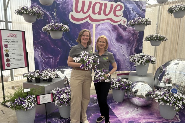 La serie de petunias E3 Easy Wave lanza un patrón bicolor azul y blanco llamado Midnight Marble. Es muy florífera y resistente al frío. E3 Easy Wave Midnight Marble florece en un fotoperiodo de 9 horas. Isabel Branstrom (izquierda) y Sarah Makiejus (derecha) sostienen estas petunias extendidas, mostrando el patrón único.