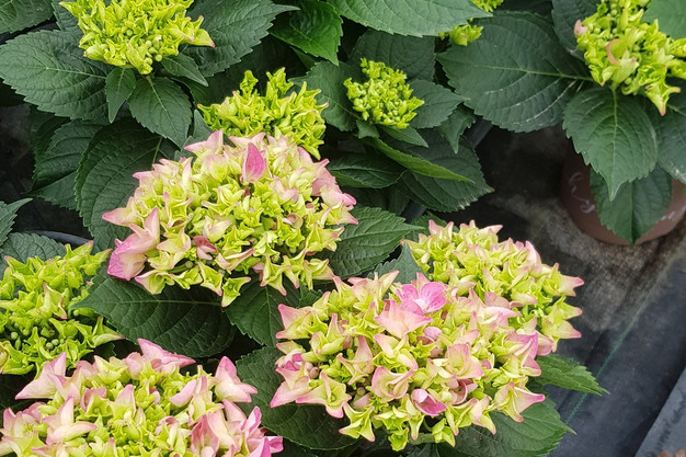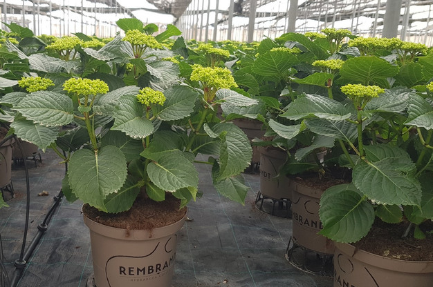La oferta de hortensia abarca distintos formatos, desde macetas de 14 a 35 centímetros, en colores tradicionales como blanco, rojo, rosa y azul o lila. A ello se suma la producción de variedades diferenciadas como la hortensia Rembrandt, con royalties, que destaca por su mayor durabilidad y por colores innovadores como verde vibran o rojo glory.