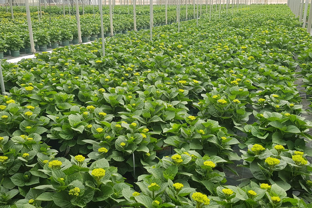 El proceso productivo comienza en diciembre, con la llegada de esquejes procedentes de Francia, que posteriormente se plantan y cultivan en Almería. Algunas variedades, como las hortensias azules o lilas, requieren tratamientos específicos, como la aplicación de sulfato de aluminio para lograr la coloración deseada.