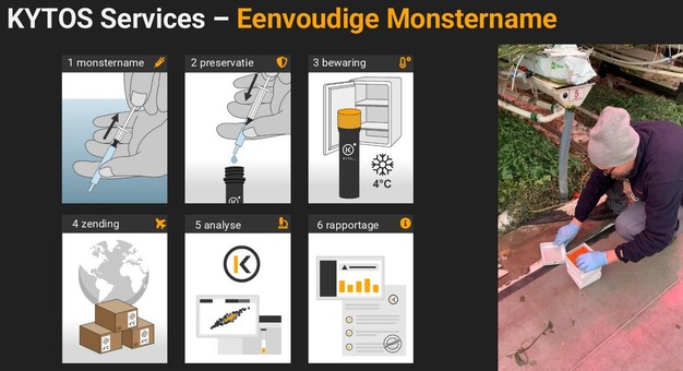 Los productores que quieran más datos pueden encargar a Kytos la realización de mediciones. Para ello, se les enviará un paquete de muestreo y análisis KytoVial. De este modo, el propio productor puede tomar muestras, que introduce en un vial con fijador desarrollado por Kytos. De este modo, la muestra puede enviarse de forma segura al laboratorio. Kytos ya ofrece este servicio a clientes de Bélgica, Países Bajos, Alemania y Francia, y también está presente en el sector de la acuicultura, con laboratorios de servicios locales en Asia. "El cliente nos envía la muestra y, el mismo día en que la recibimos, podemos proporcionarle los datos, a los que podrá acceder en la nube".