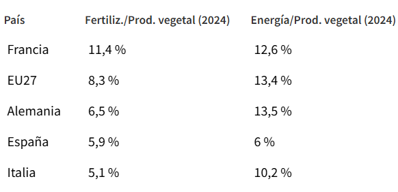 España es el país con menor exposición relativa tanto a fertilizantes como a energía entre los comparados, y se sitúa muy por debajo de la media comunitaria. En 2024, el coste de fertilizantes representa el 5,9 % del valor de la producción vegetal española, frente al 8,3 % de media en la UE27, el 11,4 % de Francia o el 6,5 % de Alemania. La brecha es aún mayor en energía: 6 % en España frente al 13,4 % comunitario. Países Bajos, con su horticultura intensiva bajo invernadero con calefacción, representa el extremo opuesto: en el pico de 2022 llegó a destinar el 25 % del valor de su producción vegetal a cubrir la factura energética.