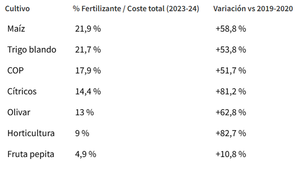 Los cultivos herbáceos son, con diferencia, la actividad en la que más pesan los fertilizantes en el coste total de producción. Según ECREA, el gasto en fertilizante representó en 2023-2024 (últimos datos disponibles) el 21,9 % del coste total de producción en el maíz, el 21,7 % en el trigo blando, y el 17,9 % en el conjunto de cultivos COP (cereales, oleaginosas y proteaginosas). Se trata además de cultivos con margen por kilogramo muy reducido que atraviesan un periodo de precios bajos, lo que los hace especialmente vulnerables a cualquier encarecimiento.