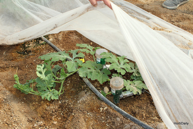 Invernadero plantado con sandía, en el que aún son visibles los estragos de las tormentas de este invierno