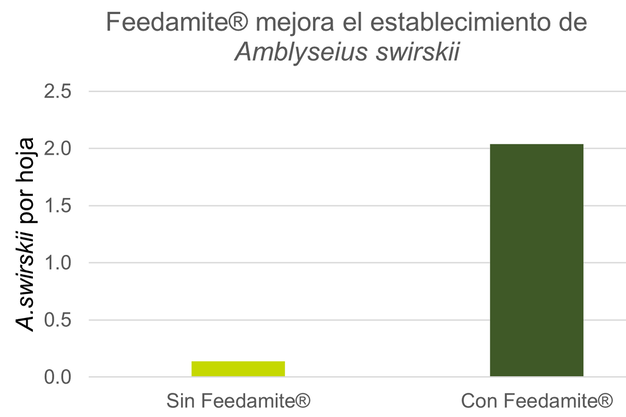 Para obtener mejores resultados, es necesario aplicar Feedamite al mismo tiempo, o poco después de la liberación de los ácaros depredadores en el cultivo. Se recomienda hacer aplicaciones semanales para mantener un suministro continuo de alimento, lo cual favorece a la estabilidad de las poblaciones de ácaros depredadores durante todo el ciclo de cultivo.
