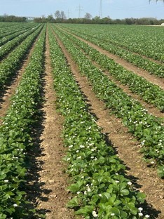 © Hensen/SanLucar seguidas de las fresas de campo abierto, que siguen creciendo y prosperando en unas 60 hectáreas. "En los últimos años hemos reducido gradualmente nuestras superficies al aire libre a favor del cultivo protegido en estanterías. Mientras tanto, la capacidad del invernadero se ha mantenido igual: debido a los elevados costes energéticos y al impuesto sobre el CO₂, por el momento no podemos ampliarla. Tampoco descarto categóricamente la posibilidad de que a medio o largo plazo solo cultivemos plantas remontantes en el invernadero, ya que se pueden cultivar con un menor aporte energético", concluye Hensen.