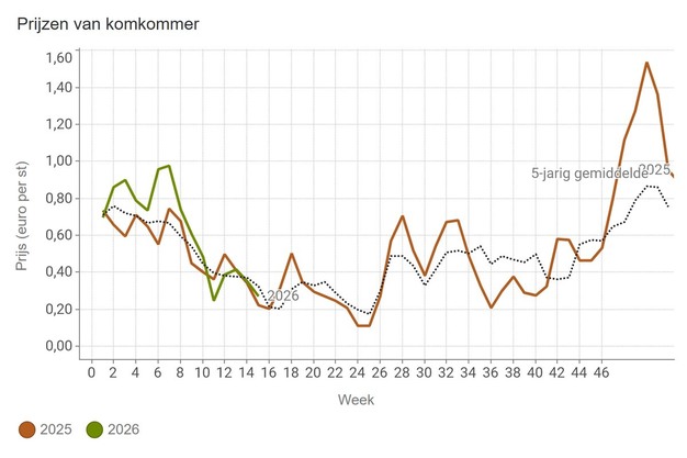 El precio del pepino se sitúa en 12 céntimos de euro cada uno al final de la semana 16.