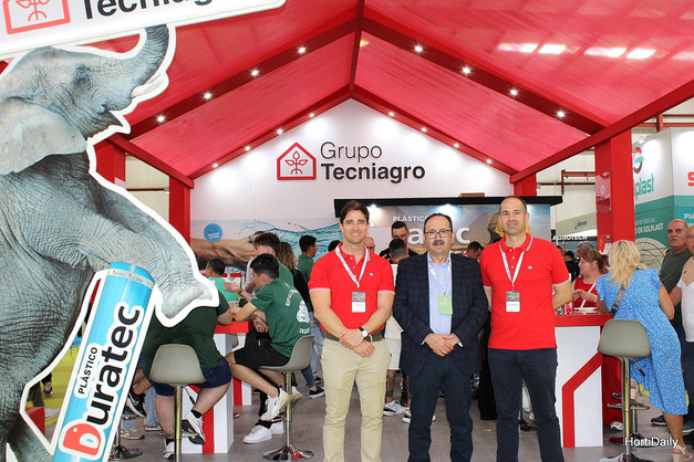 Daniel Correa, Paco Fernández y Javier Fernández en el stand de Grupo Tecniagro, cuyo techo estaba formado por las mallas fotoselectivas de la firma.