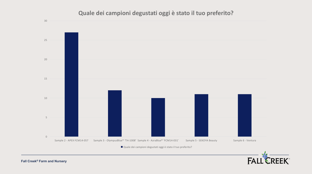 © Fall CreekLa cata incluyó cinco muestras identificadas de forma anónima, entre ellas materiales propios de Fall Creek del tipo zero/low chill como Ventura, OlympusBlue® y AzraBlue®, junto con Sekoya Beauty y su última incorporación al programa Collection, Apex® FCM14-057. Este enfoque de blind tasting permitió eliminar sesgos y obtener una valoración puramente organoléptica por parte de los participantes.