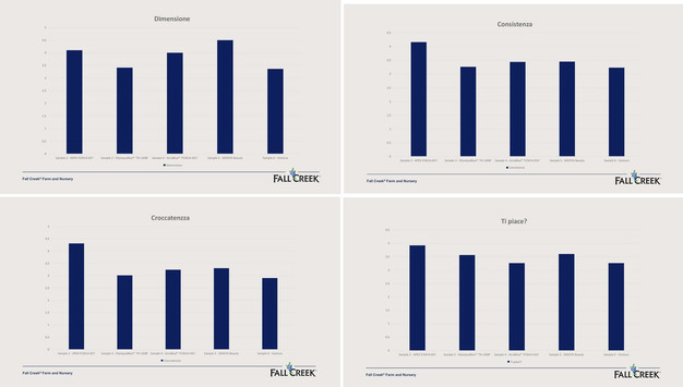 En sabor, las puntuaciones se concentran en un rango estrecho —aproximadamente entre 3,2 y 3,6 sobre 4—, lo que indica que el estándar medio de las variedades participantes en la cata ya es elevado. Sin embargo, dentro de ese rango reducido, Apex fue la que obtuvo la mayor puntuación.